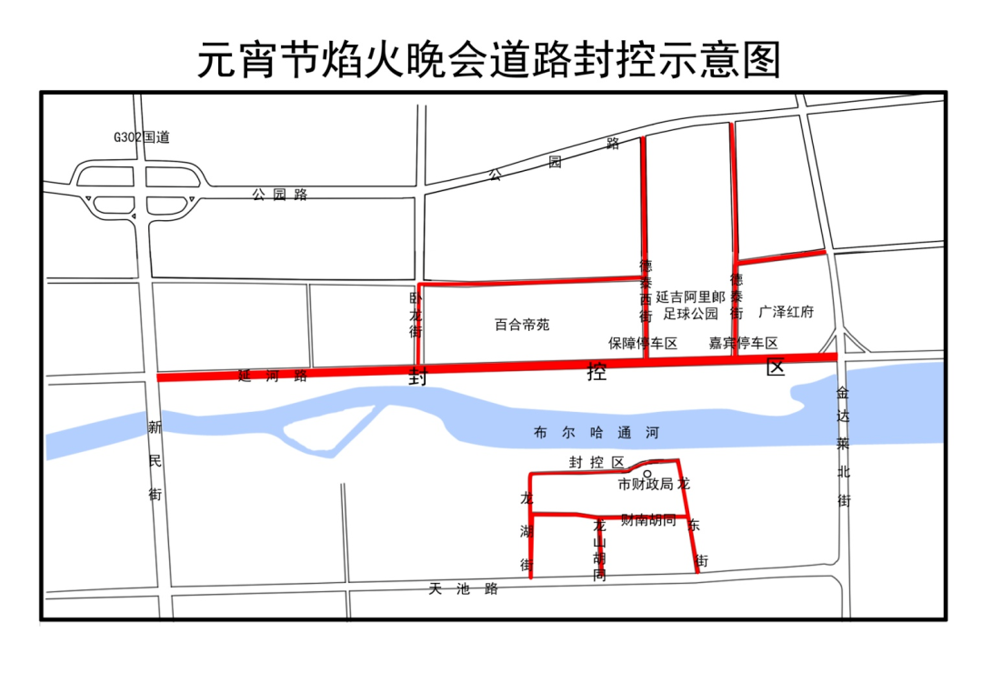 河南区域:金达莱南街;天池路(金达莱南街至龙湖街);天池大桥道路。