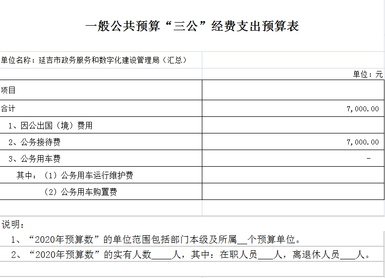 2020年“三公”经费预算数为 0.7 万元,比 2019 年预算 数增加0.4万元。其中: 延吉市政务服务和数字化建设管理是新成立部门,去年没有做年初预算,所以今年三公经费增加