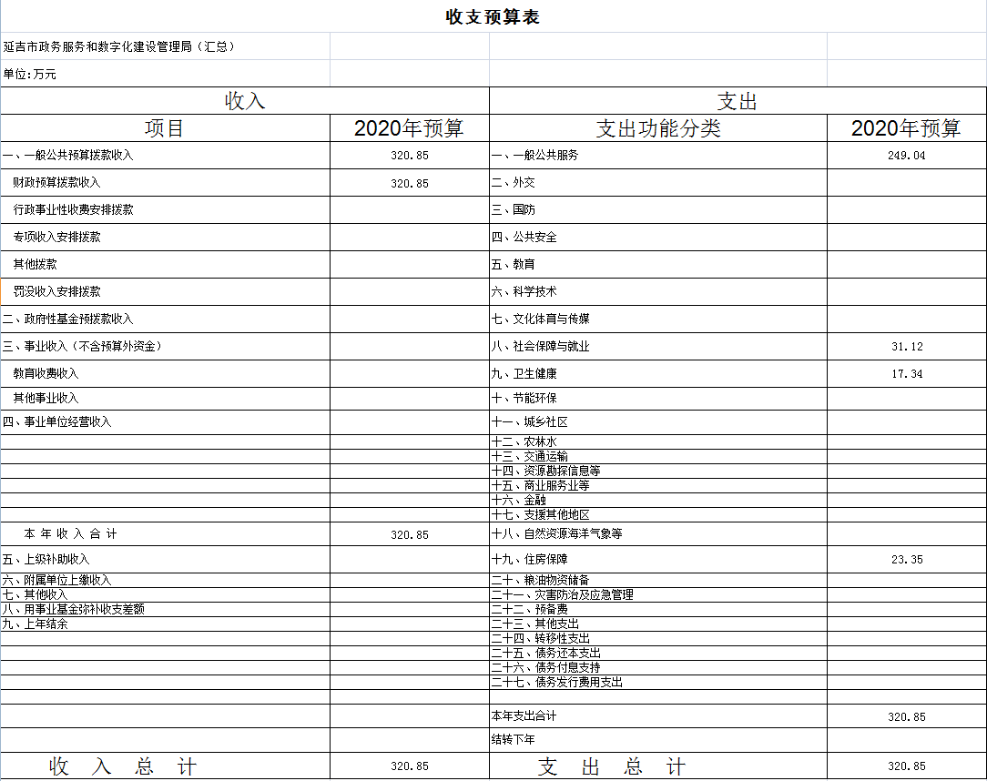 按照综合预算的原则,所有收入和支出全部纳入部门预算管理。收入包括:一般公共预算拨款收入、政府性基金预算拨款收入、事业收入、事业单位经营收入、其他收入、用事业基金弥补收支差额、上年结转等;支出包括:一般公共服务支出、教育支出、科学技术支出、文化体育与传媒支出、社会保障和就业支出、农林水支出、住房保障支出、结转下年支出等。2020 年收支总预算320.85万元,比2019年预算增加13.66万元, 主要原因:一是编制内人员增加,相应按定额标准核定的基本支出增加;