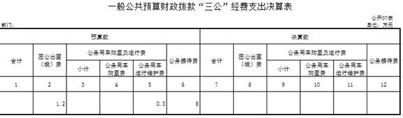 2019年度“三公”经费财政拨款支出决算中,因公出国(境)费支出决算为 1.2万元,占1 %;公务用车购置及运行费支出决算为 0.3万元,占 0.03 %;公务接待费支出决算为 8 万元,占 8 %。具体情况如下: